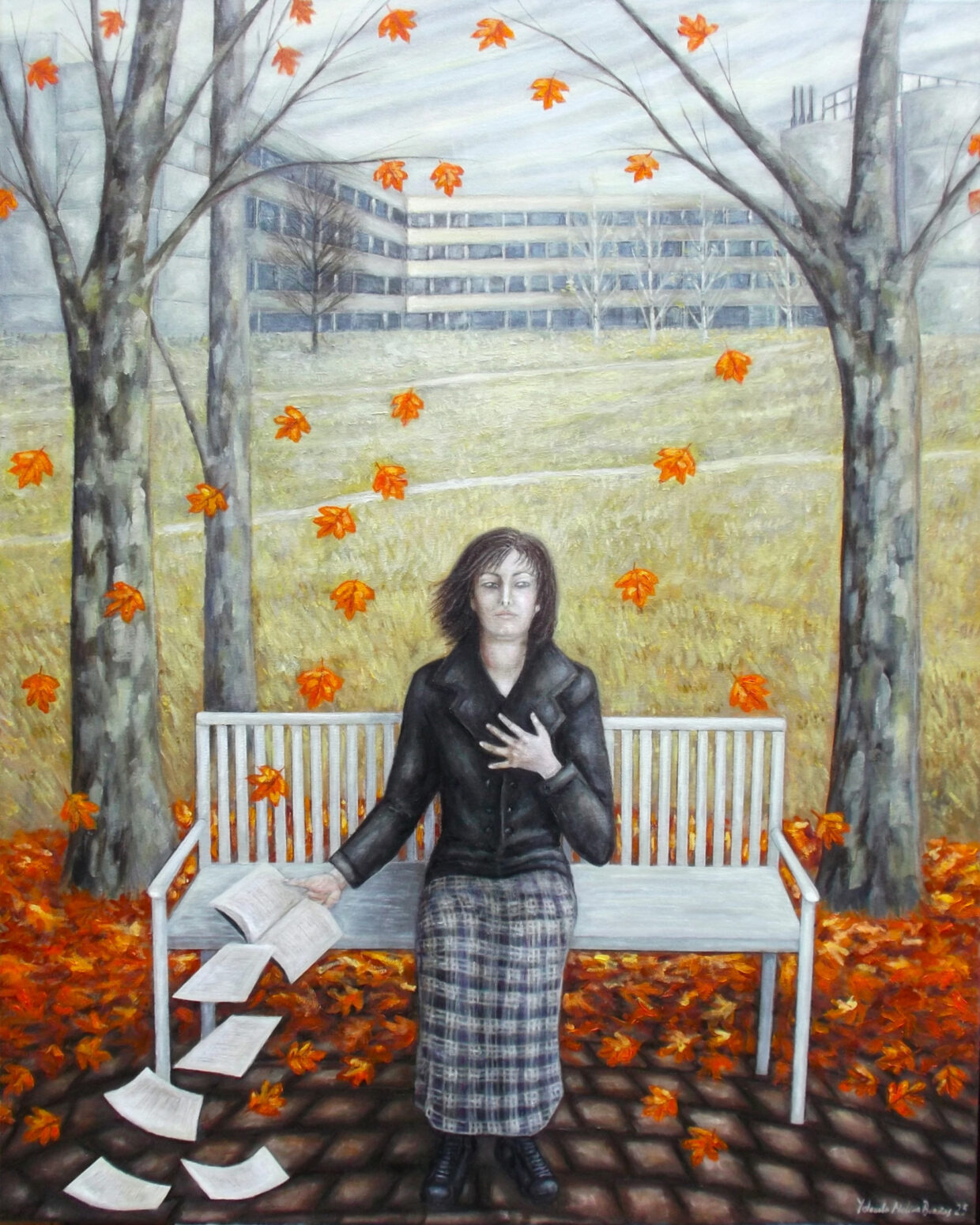 Las hojas del libro, dispersas en el suelo como confidencias traicionadas, se funden con las auténticas hojas otoñales que caen en espiral, creando una simetría poética entre lo escrito y lo efímero. Es aquí donde la técnica de Molina Brañas brilla: su óleo, aplicado en capas translúcidas que recuerdan a los velos de la escuela impresionista, genera una profundidad atmosférica que difumina los contornos, haciendo que el fondo —un prado amarillento salpicado de árboles esbeltos— se desvanezca en una niebla grisácea, como si el lienzo respirara.